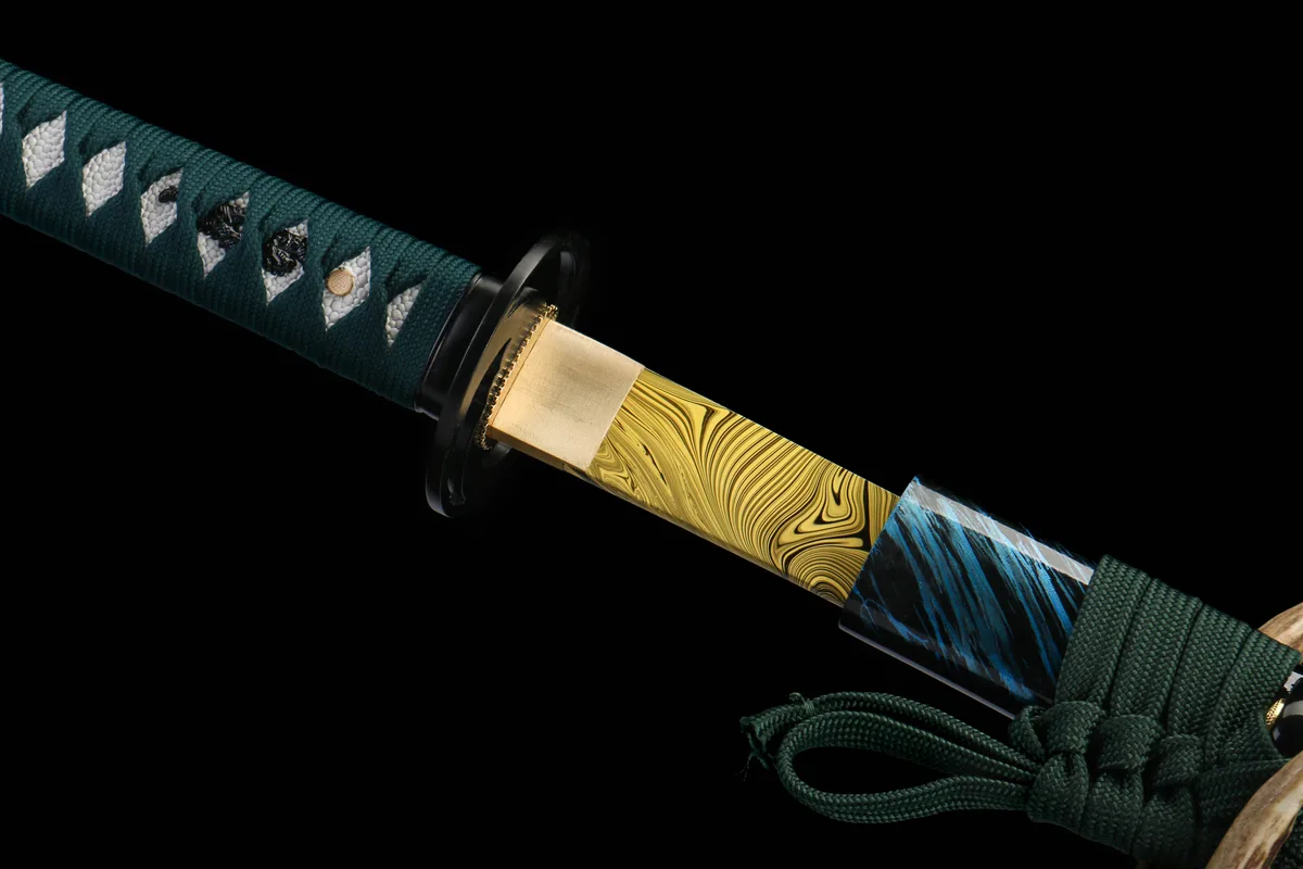 1045 carbon steel contains approximately 0.45% carbon, making it a medium-carbon steel that is tough, shock-resistant, and relatively easy to sharpen. For the Azure Void Beckons katana, a special forging process is applied to enhance its performance beyond standard 1045. While softer than high-carbon steels like T10, 1045 is a solid entry-level choice offering good durability and resistance to chipping — ideal for beginners learning cutting techniques or kata practice.
