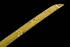 The Azure Void Beckons features a solid wood saya (sheath) finished with a piano-lacquer coating and decorative hollow floral carving. This high-gloss lacquer finish provides both protection against moisture and a visually striking appearance that complements the sword’s elegant name and aesthetic. The carved floral cutwork adds an artistic, collector-friendly detail rarely seen at this price point, making it a standout display piece as well as a functional scabbard.