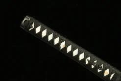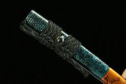 The shinogi-zukuri profile is executed with the same care given to our premium-tier blades: the ridgeline runs cleanly from the habaki to the yokote, and the kissaki geometry is well-proportioned for a sword of this length. The Aohada saya’s natural bark texture offers a practical, secure draw surface, while the green-grey tones provide a striking visual counterpoint to the warm golden blade. Cotton ito wraps the tsuka firmly in the traditional diamond lozenge pattern — clean, functional, and respectful of the classical form.