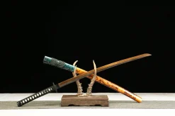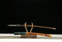 The Dark Gold Radiance katana — 玄金之耀, the gleam of deep gold from within darkness — introduces T10 high-speed tool steel to the mid-range tier at $180, offering a step up in edge retention and wear resistance over standard 1065 carbon steel at a price that remains accessible to dedicated enthusiasts. The 烤金 (gold-baked) surface treatment bathes the blade in a warm amber-gold finish that gives Dark Gold Radiance its name: a sword that appears to glow from within, as though the forge heat never fully left the steel. Mounted on a green Aohada sheath with clean cotton ito and shinogi-zukuri geometry, this is a no-nonsense performance katana wrapped in understated luxury.