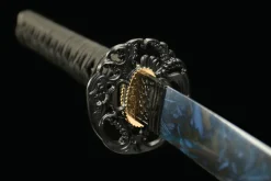 The Dusk Fang is built around straightforward 1045 carbon steel — no special treatment designations, no premium alloy additions, just honest medium-high carbon steel worked by Longquan craftsmen into a shinogi-zukuri profile that has served samurai and swordsmiths alike for centuries. This directness is the Dusk Fang’s strength. At 0.45% carbon, the steel is tough and responsive, ground to a geometry that prioritizes cutting performance and balanced handling over metallurgical showmanship. For a collector or student who wants a clean, honest katana without paying for treatments they may not yet appreciate, the Dusk Fang delivers exactly what it promises: a real sword, properly made, at a price that respects the buyer’s budget.