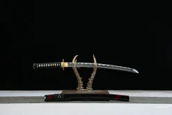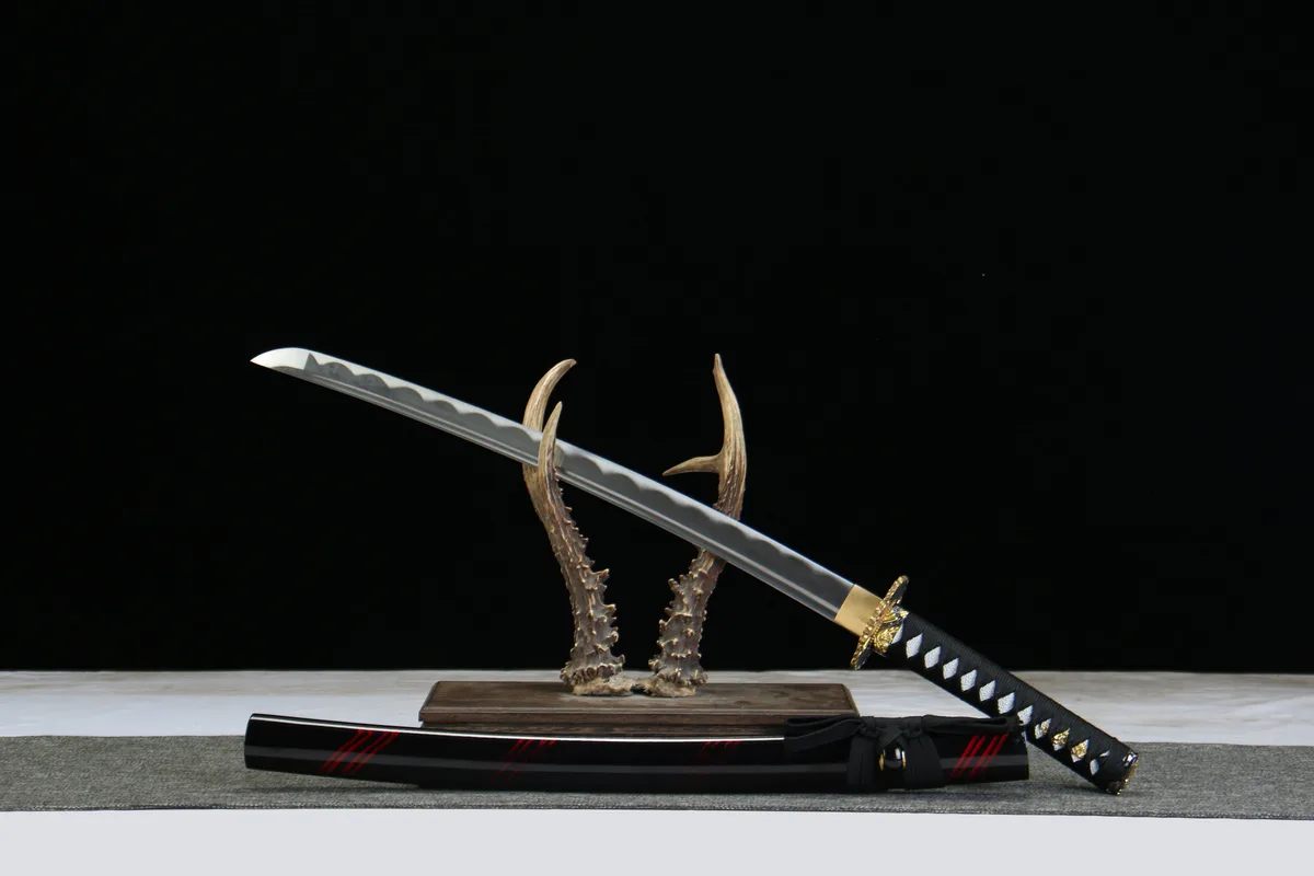 Forged in Longquan — a city whose sword-making tradition stretches back over 2,600 years — the Flame Shadow is built from 1045 carbon steel, a medium-high carbon alloy that strikes the ideal balance for an entry-level functional wakizashi. With roughly 0.45% carbon content, this steel takes an oil quench and temper beautifully, producing a blade with a reliable hardened edge and a tough, resilient spine. The result is a sword that can be handled, practiced with, and displayed without the fragility concerns of higher-carbon steels.