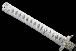 Pale frost-toned blade with hollow-carved lacquered saya and cotton ito wrap