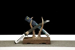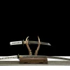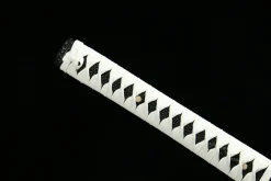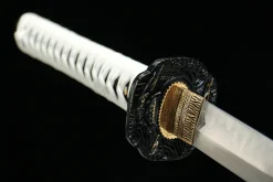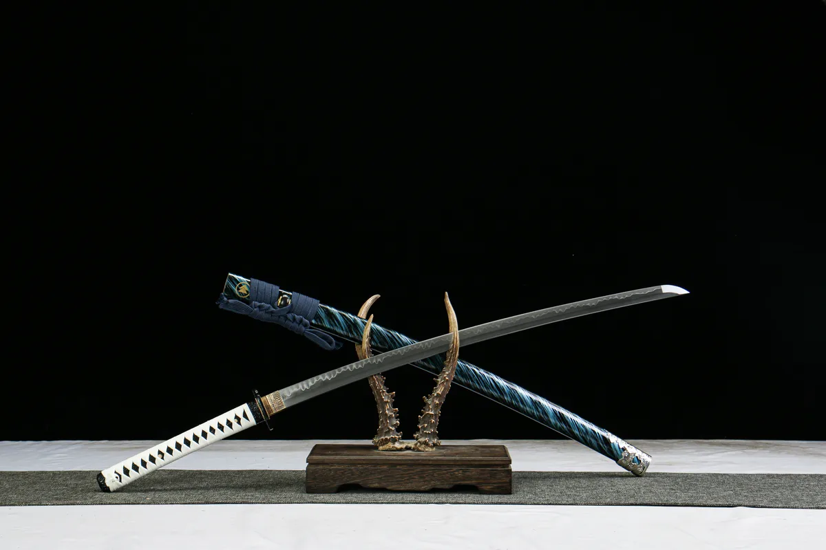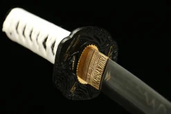Clay tempering is the traditional Japanese process of coating the blade’s spine with clay before quenching. The clay insulates the spine so it cools slowly — remaining tough — while the bare edge quenches hard. This creates differential hardness and the authentic wavy hamon (temper line) visible along the blade. The Ghost of Tsushima katana (LQS-0004) features genuine clay-tempered T10 steel, meaning the hamon is a true metallurgical feature, not a cosmetic acid-etched imitation.