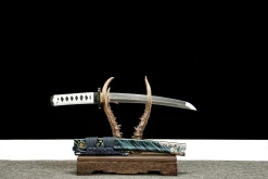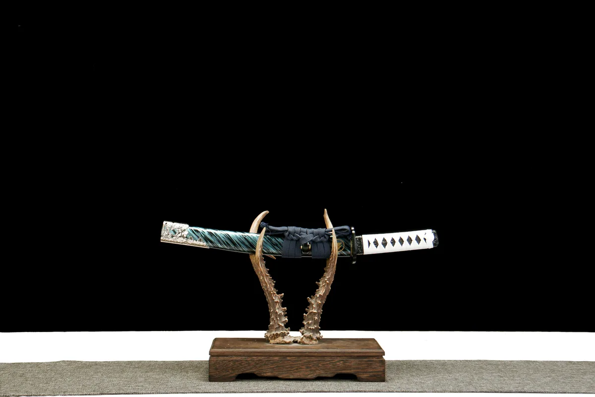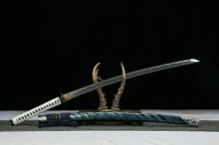 The Ghost of Tsushima — Hamon Edition (对马岛之魂·烧刃款) katana is a full-length, clay-tempered T10 tool steel sword built for fans and collectors who want Jin Sakai’s iconic blade rendered at true katana scale — 103 cm overall, with a genuine differential-hardened hamon that no two swords share. Where the companion wakizashi captures the intimacy of close-quarters combat, this katana version commands the room: a 72 cm blade with the visual authority of a real samurai’s primary weapon, housed in a green Aohada saya. Priced at $250, it brings authentic clay-tempering to a pop-culture tribute at a cost that surprises even experienced buyers.