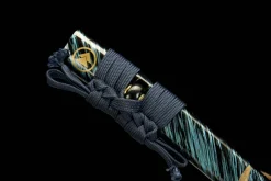 This katana (LQS-0004, 对马岛之魂烧刃款) is inspired by Jin Sakai’s primary blade from Sony’s Ghost of Tsushima, incorporating design elements like the green Aohada wood sheath and the clay-tempered blade finish referenced by the ‘烧刃’ (yakiba/clay tempered) designation. It is not an officially licensed Sony product but is crafted as a high-quality tribute piece for fans of the game seeking a functional, display-worthy replica with authentic Japanese sword construction techniques.