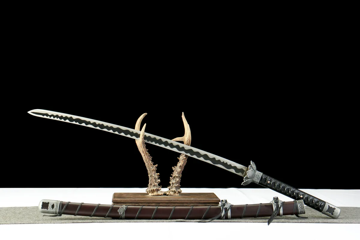 65Mn spring steel benefits from the same core maintenance routine as all carbon steels — dry thoroughly after use and apply a light coat of choji oil — but its manganese content means it is somewhat more forgiving of brief humidity exposure than comparable 1095 blades, giving practitioners a modest extra margin before surface rust begins to form. The blade’s spring characteristics mean it should never be stored in a bent or stressed position; always sheathe it fully in the saya and store horizontally on a sword stand to preserve the blade’s natural geometry over time. For sharpening, use progressive water stones starting at 1000 grit to maintain the factory edge angle, taking care to work the full length of the ha evenly to preserve the shinogi-zukuri geometry.