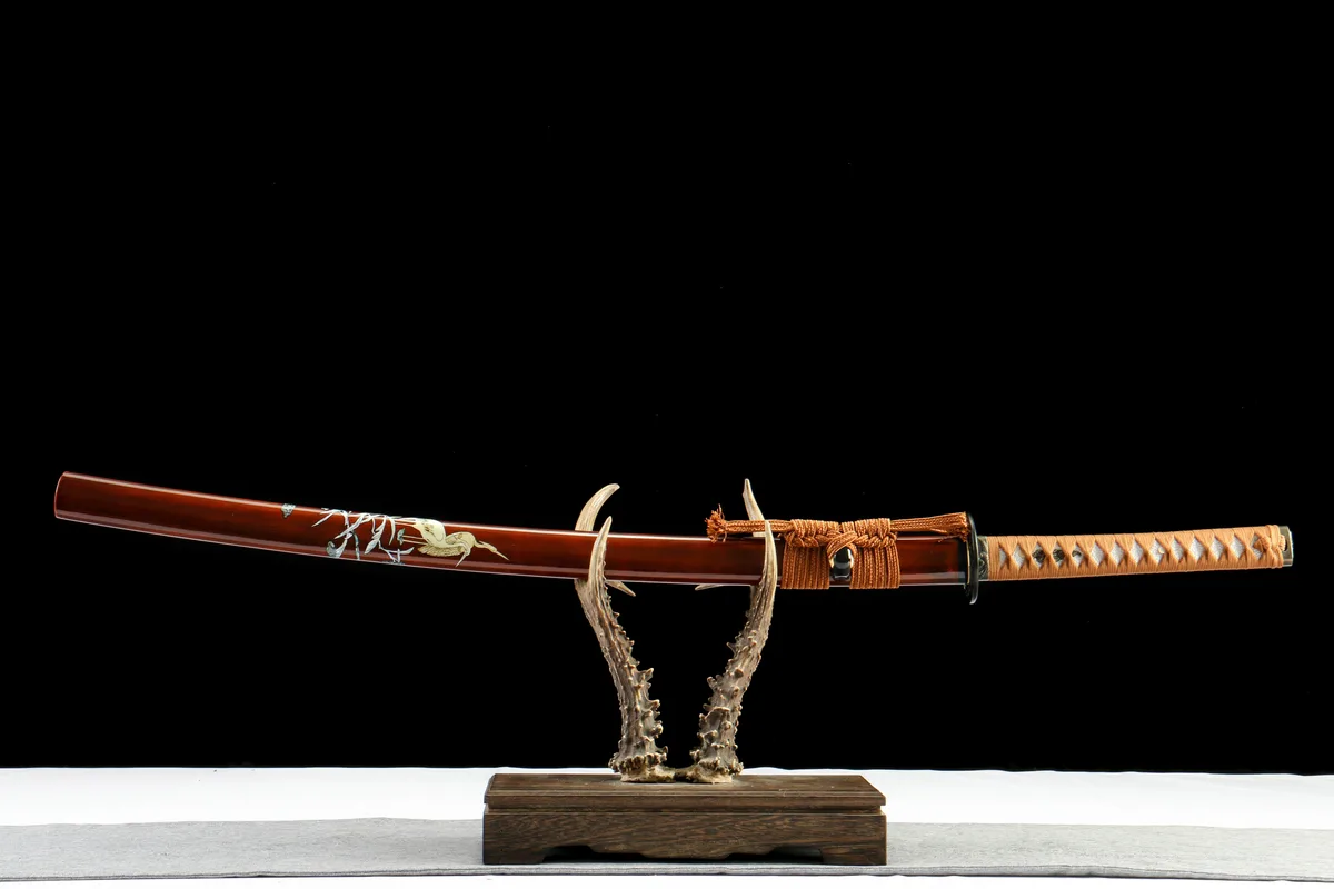 1065 high carbon steel requires consistent care — oil the blade lightly with choji oil after every handling session, wiping from base to tip with a soft, lint-free cloth to remove fingerprints and moisture before applying oil. The iron fittings, including the crane-motif tsuba, will develop a natural dark patina with age that should be preserved rather than polished away; a light wipe with a dry cloth is sufficient for fitting maintenance. Store horizontally in the saya, edge upward, in a cool, dry environment away from temperature fluctuations that could affect the lacquered sheath.