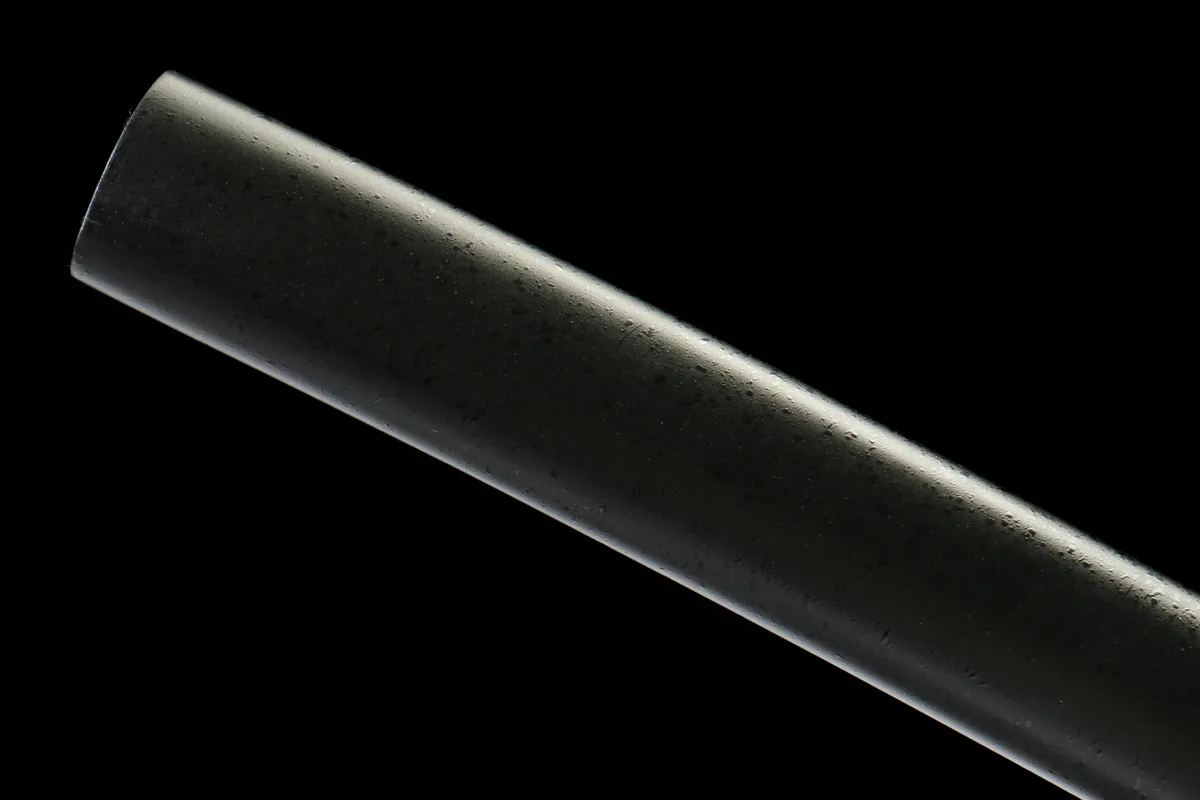 The tsuka assembly is where the Tempered Mist steps decisively ahead of entry-level T10 offerings: genuine rayskin (same) is fitted beneath the cotton ito wrap, its pebbly nodular surface locking the wrap in place and providing the palm with a tactile anchor that becomes especially noticeable during rapid noto (sheathing) or extended kata sequences. This is not merely an aesthetic upgrade — it is a functional one that you feel in every grip. The high-gloss lacquered hardwood saya completes a presentation that speaks of considered craftsmanship, the deep lacquer finish echoing the polished calm of the blade itself.